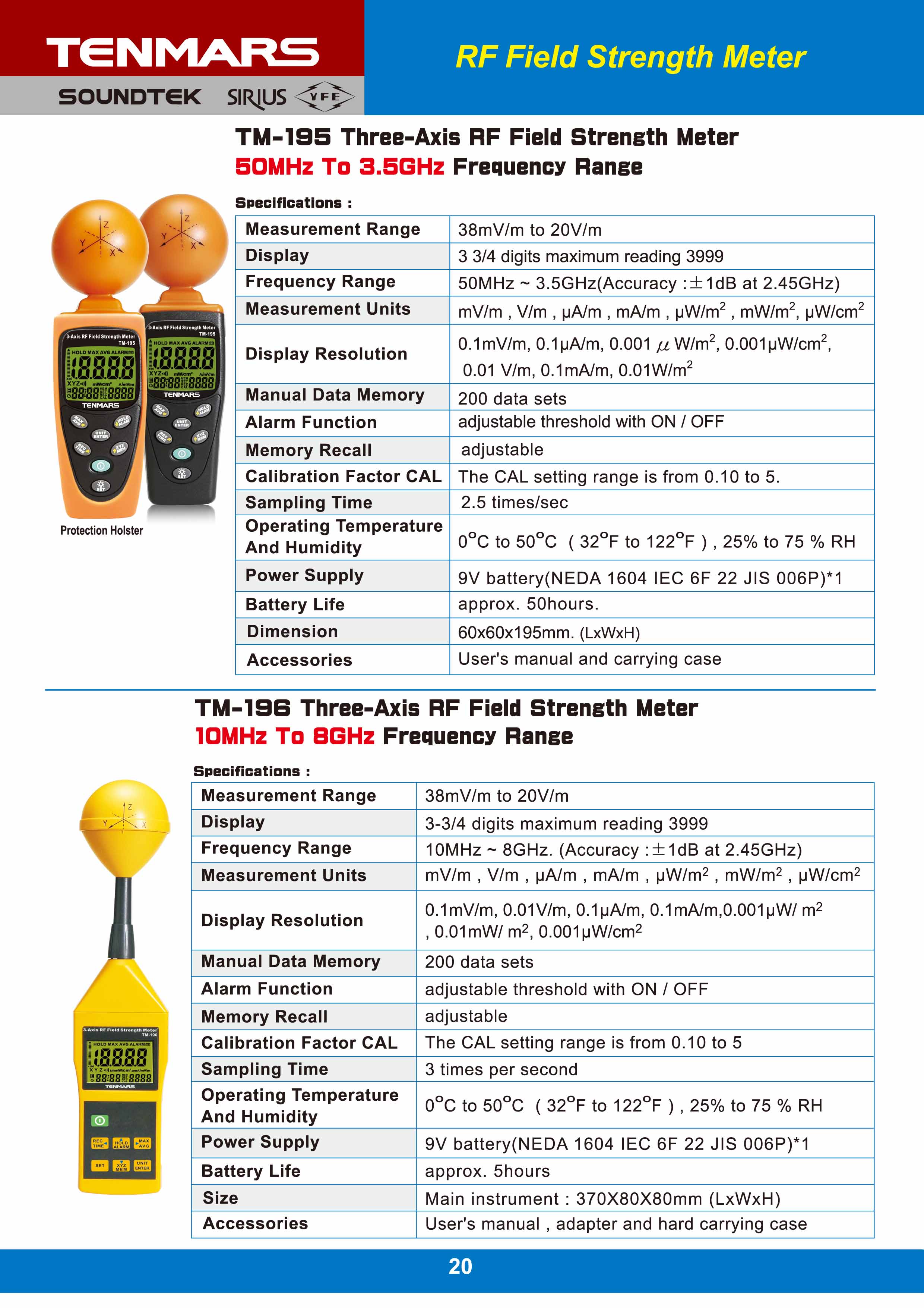 - ช่วงการวัด RF 38mV ถึง 20V/M