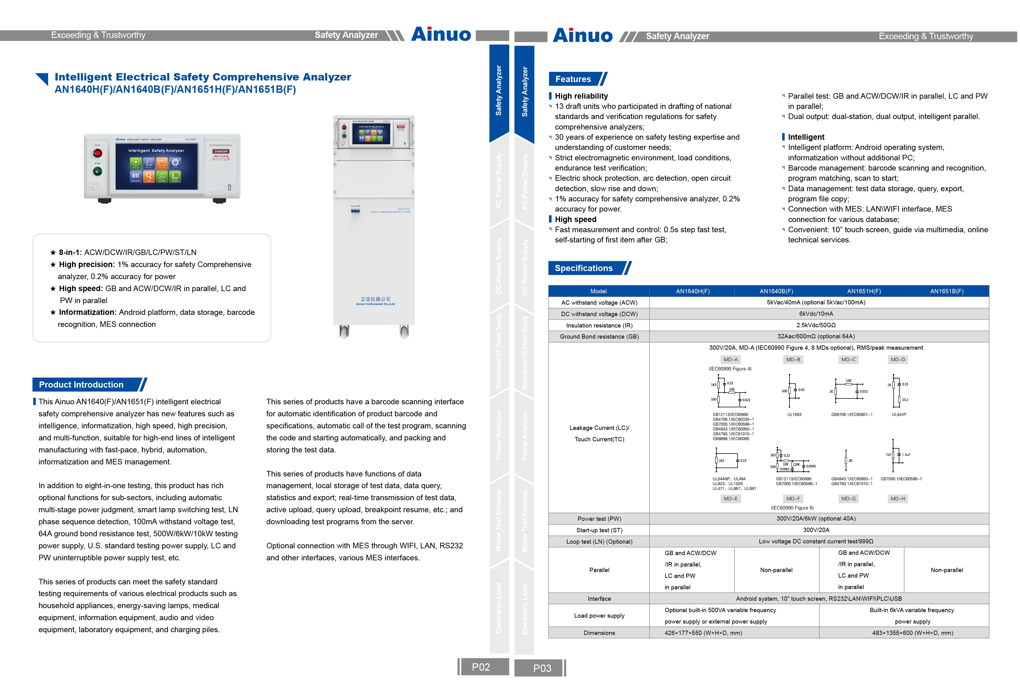 เป็นรุ่นที่มีความแม่นยำสูงมากที่ระดับ 1% และความเร็วสูงในการทดสอบเร็วสุด 0.5 วินาที โดยใช้เทคโนโลยีที่ได้รับการจดสิทธิบัตร (สายดิน, แรงดันไฟฟ้าทนต่อการทดสอบแบบขนาน) ได้อย่างรวดเร็วและมีประสิทธิภาพ ประสิทธิภาพด้านความปลอดภัยแบบบูรณาการและการทดสอบสมรรถนะไฟฟ้าโดย 1 สถานี เพียงกดครั้งเดียว มีระบบอัจฉริยะที่ Built-in 100 กลุ่มของเงื่อนไขการทดสอบในหน่วยความจำ เพื่อการขยายตัวในการทดสอบระบบแบบอัตโนมัติ พร้อมกับรองรับโดยการเลือกการใช้งานอินเตอร์เฟส ต่างๆ RS232 หรือ RS485 หรือ GPIB หรือ Ethernet, มีระบบบาร์โค้ดสแกนอินเตอร์เฟซ ที่อินเตอร์เฟซการควบคุมพลังงานความถี่ตัวแปรเขียนวิเคราะห์อัตโนมัติ
