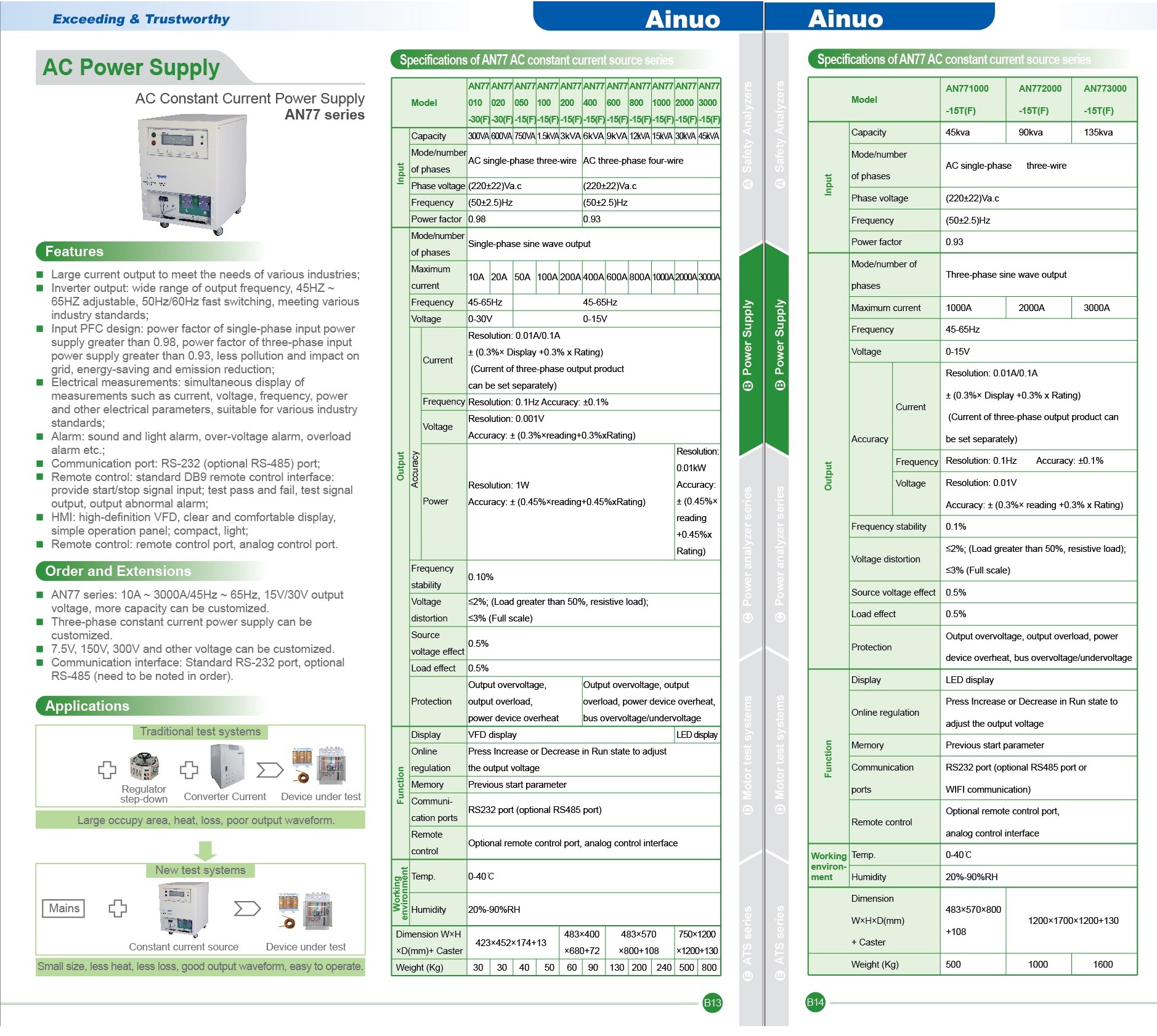 แหล่งจ่ายไฟเอซี เอาท์พุทเฟสเดียว Single-output Frequency Conversion AC Power Supply AN97000(F) Single phase output series รายละเอียดทั่วไป: การใช้งานความถี่พัลส์เอฟเอ็มสูงความกว...