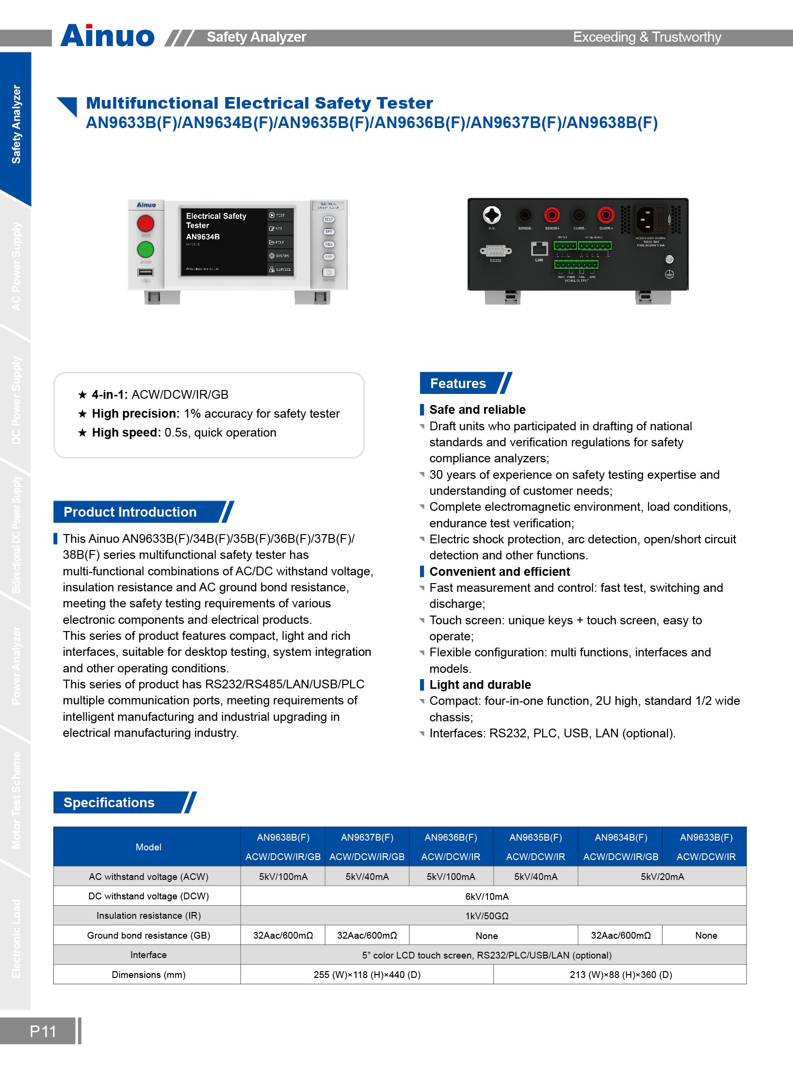 เครื่องวิเคราะห์ความปลอดภัยแบบครอบคลุมด้านความปลอดภัยแบบมัลติฟังก์ชั่นนี้มีการผสมผสานแบบอเนกประสงค์ของ AC/DC ที่ทนทานต่อแรงดันไฟ ความต้านทานของฉนวน และความต้านทานพันธะกราวด์ AC ตรงตามข้อกำหนดการทดสอบความปลอดภัยของส่วนประกอบอิเล็กทรอนิกส์และผลิตภัณฑ์ไฟฟ้าต่างๆ ชุดผลิตภัณฑ์นี้มีอินเทอร์เฟซที่กะทัดรัด น้ำหนักเบา และสมบูรณ์ เหมาะสำหรับการทดสอบเดสก์ท็อป การรวมระบบ และสภาวะการทำงานอื่นๆ ผลิตภัณฑ์ซีรีส์นี้มีพอร์ตการสื่อสารหลายพอร์ต RS232/RS485/LAN/USB/PLC ตรงตามข้อกำหนดของการผลิตอัจฉริยะและการยกระดับอุตสาหกรรมในอุตสาหกรรมการผลิตไฟฟ้า
